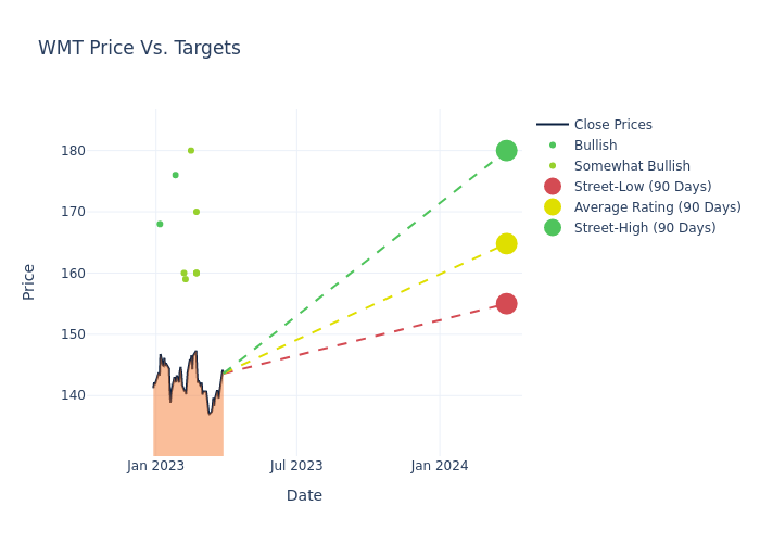 In the last 3 months, 13 analysts have offered 12-month price targets for Walmart. The company has an average price target of $164.23 with a high of $180.00 and a low of $155.00.