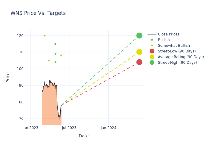 In the last 3 months, 8 analysts have offered 12-month price targets for WNS (Hldgs). The company has an average price target of $108.25 with a high of $120.00 and a low of $97.00.
