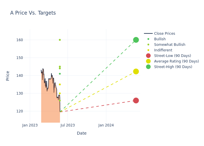 In the last 3 months, 14 analysts have offered 12-month price targets for Agilent Technologies. The company has an average price target of $146.36 with a high of $174.00 and a low of $126.00.