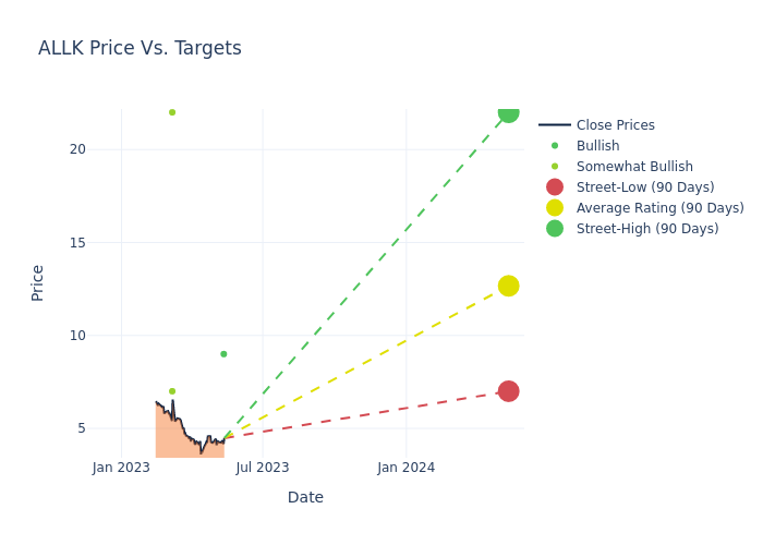 In the last 3 months, 4 analysts have offered 12-month price targets for Allakos. The company has an average price target of $11.25 with a high of $22.00 and a low of $7.00.