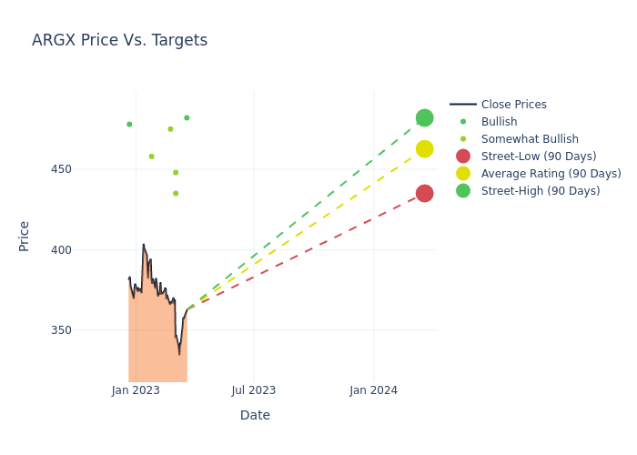 In the last 3 months, 8 analysts have offered 12-month price targets for argenx. The company has an average price target of $467.0 with a high of $482.00 and a low of $435.00.