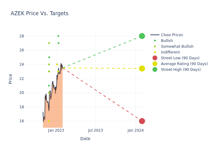 In the last 3 months, 12 analysts have offered 12-month price targets for AZEK Co. The company has an average price target of $23.42 with a high of $28.00 and a low of $16.00.