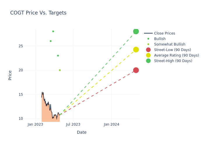 In the last 3 months, 5 analysts have offered 12-month price targets for Cogent Biosciences. The company has an average price target of $24.0 with a high of $28.00 and a low of $20.00.