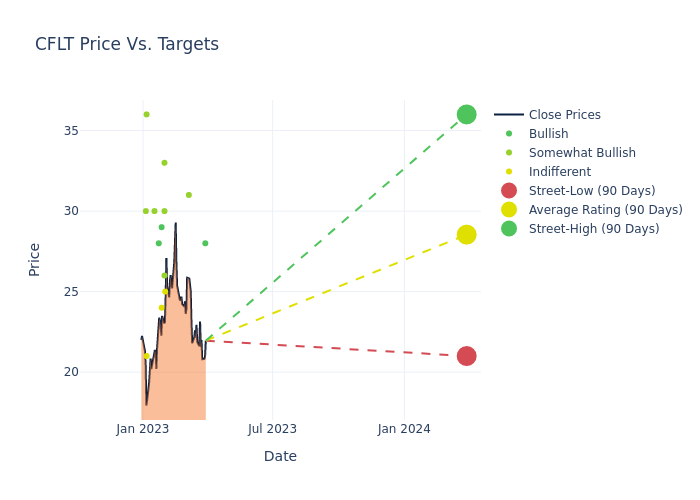 In the last 3 months, 17 analysts have offered 12-month price targets for Confluent. The company has an average price target of $28.82 with a high of $36.00 and a low of $21.00.