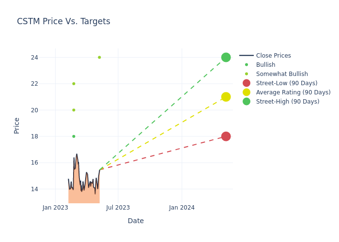 According to 4 analyst offering 12-month price targets in the last 3 months, Constellium has an average price target of $21.0 with a high of $24.00 and a low of $18.00.