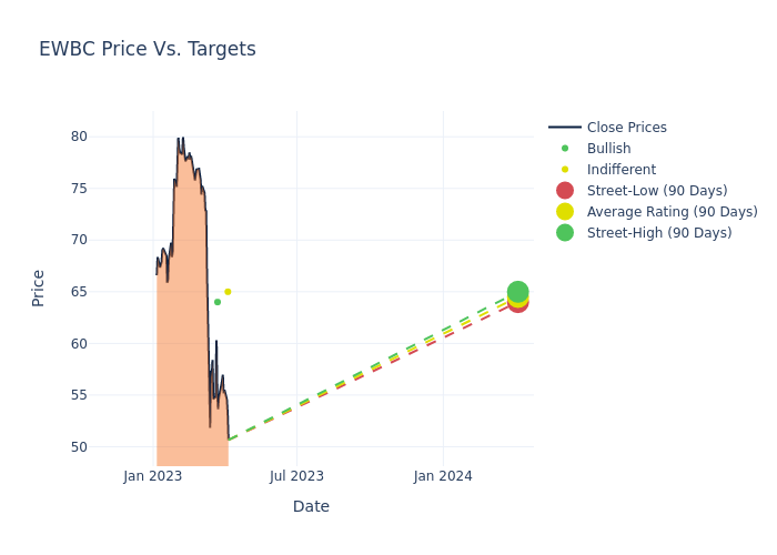In the last 3 months, 4 analysts have offered 12-month price targets for East West Bancorp. The company has an average price target of $75.5 with a high of $88.00 and a low of $64.00.