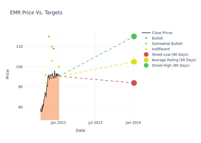 In the last 3 months, 11 analysts have offered 12-month price targets for Emerson Electric. The company has an average price target of $99.73 with a high of $115.00 and a low of $90.00.