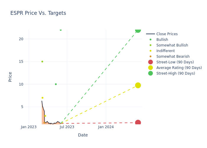 In the last 3 months, 12 analysts have offered 12-month price targets for Esperion Therapeutics. The company has an average price target of $12.88 with a high of $22.00 and a low of $1.50.