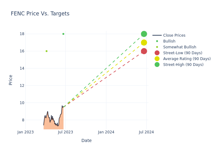According to 4 analyst offering 12-month price targets in the last 3 months, Fennec Pharmaceuticals has an average price target of $17.5 with a high of $18.00 and a low of $16.00.