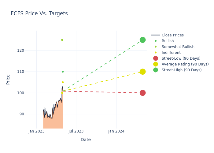 According to 5 analyst offering 12-month price targets in the last 3 months, FirstCash Hldgs has an average price target of $109.6 with a high of $125.00 and a low of $100.00.