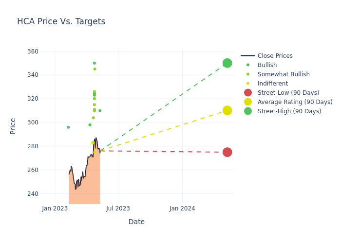According to 24 analyst offering 12-month price targets in the last 3 months, HCA Healthcare has an average price target of $304.08 with a high of $350.00 and a low of $257.00.