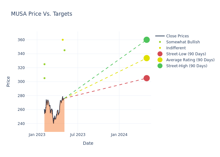 In the last 3 months, 4 analysts have offered 12-month price targets for Murphy USA. The company has an average price target of $333.75 with a high of $360.00 and a low of $305.00.