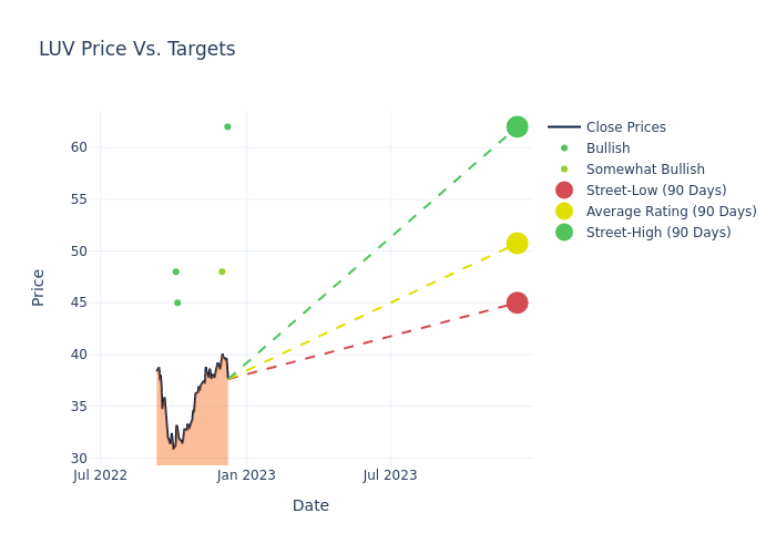 In the last 3 months, 4 analysts have offered 12-month price targets for Southwest Airlines. The company has an average price target of $50.75 with a high of $62.00 and a low of $45.00.