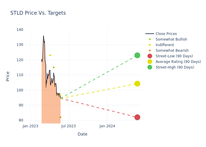 In the last 3 months, 6 analysts have offered 12-month price targets for Steel Dynamics. The company has an average price target of $103.17 with a high of $123.00 and a low of $82.00.