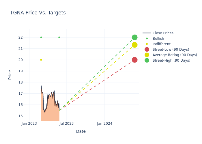 According to 5 analyst offering 12-month price targets in the last 3 months, Tegna has an average price target of $21.6 with a high of $22.00 and a low of $20.00.