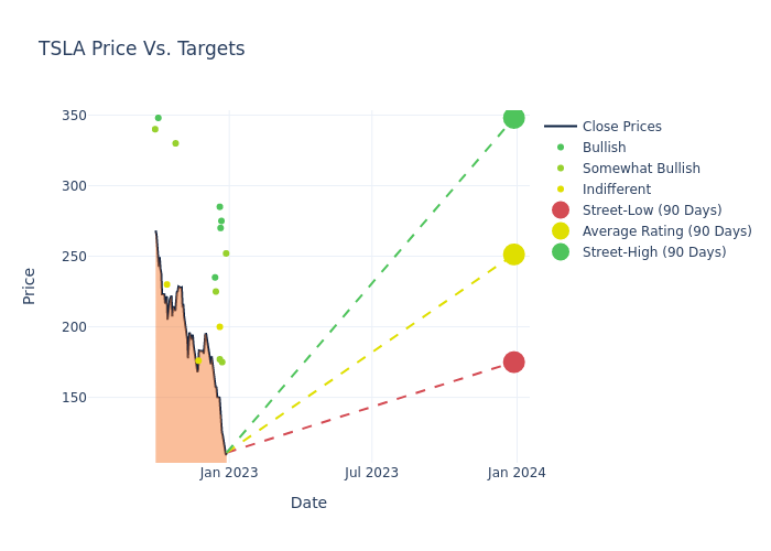 According to 20 analyst offering 12-month price targets in the last 3 months, Tesla has an average price target of $277.05 with a high of $370.00 and a low of $175.00.