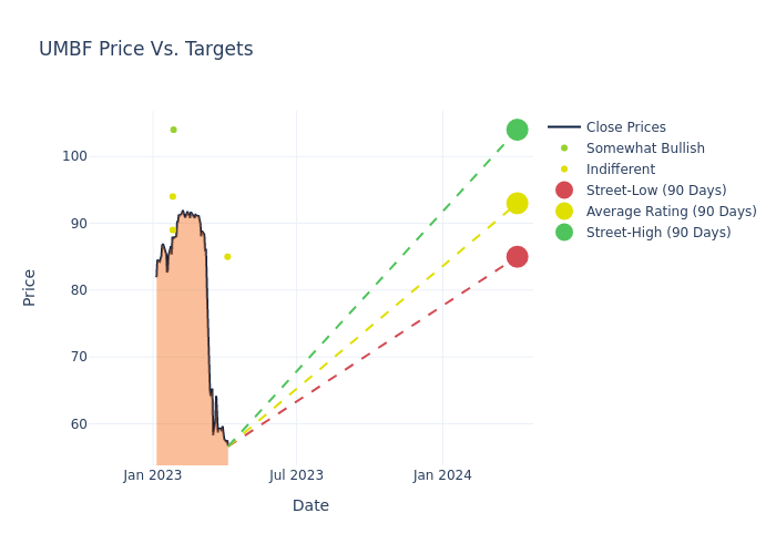 In the last 3 months, 5 analysts have offered 12-month price targets for UMB Financial. The company has an average price target of $93.4 with a high of $104.00 and a low of $85.00.