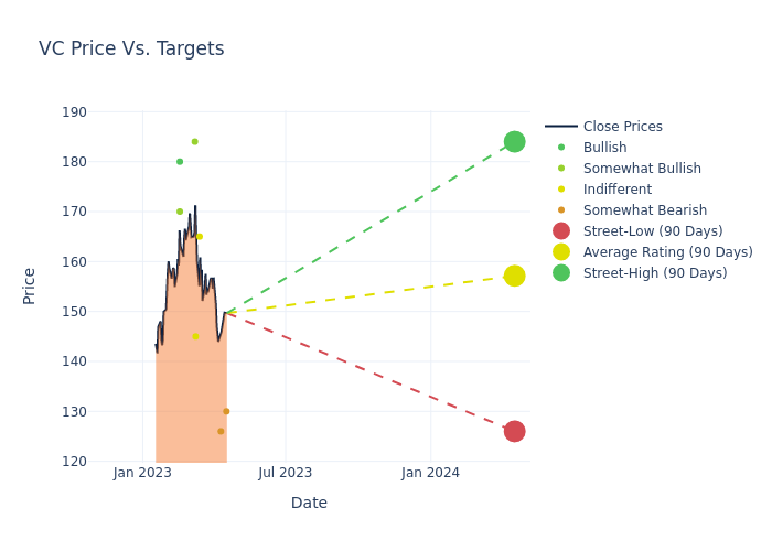 According to 10 analyst offering 12-month price targets in the last 3 months, Visteon has an average price target of $148.5 with a high of $184.00 and a low of $125.00.