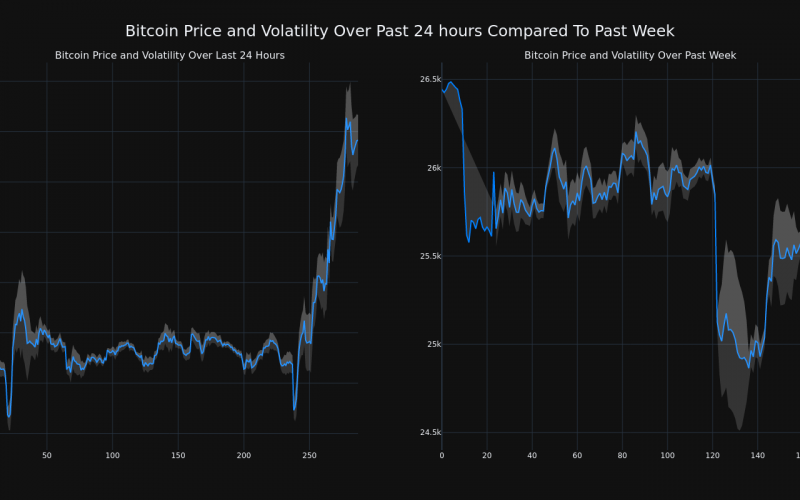 Over the past 24 hours, Bitcoin’s (CRYPTO: BTC) price has risen 3.88% to $26,337.00. This is contrary to its negative trend over the past week where it has experienced a 1.0% loss, moving from $26,444.35 to its current price. As it stands right now, the coin’s all-time high is $69,045.00.