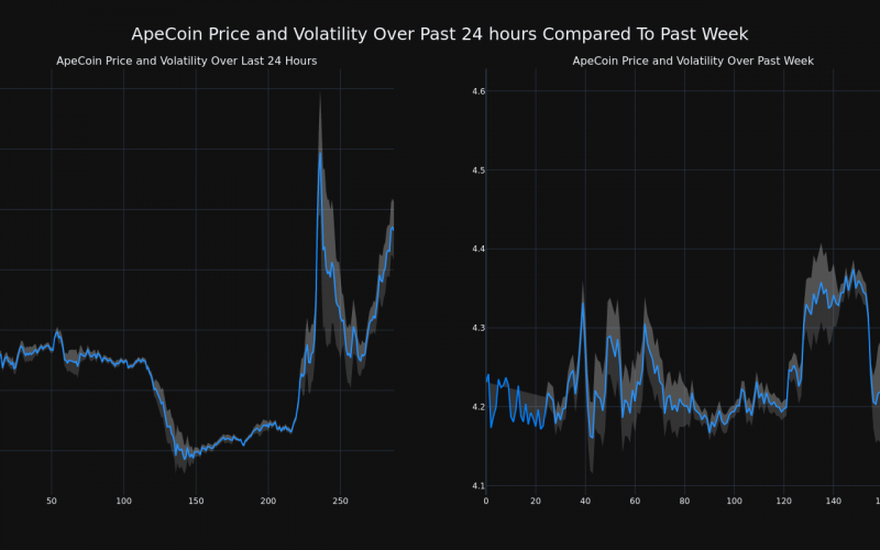 The chart below compares the price movement and volatility for ApeCoin over the past 24 hours (left) to its price movement over the past week (right). The gray bands are Bollinger Bands, measuring the volatility for both the daily and weekly price movements. The wider the bands are, or the larger the gray area is at any given moment, the larger the volatility.