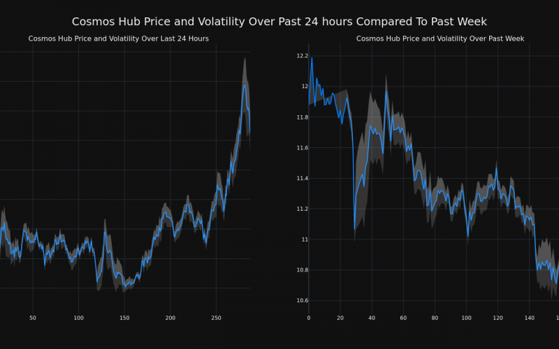 The chart below compares the price movement and volatility for Cosmos Hub over the past 24 hours (left) to its price movement over the past week (right). The gray bands are Bollinger Bands, measuring the volatility for both the daily and weekly price movements. The wider the bands are, or the larger the gray area is at any given moment, the larger the volatility.