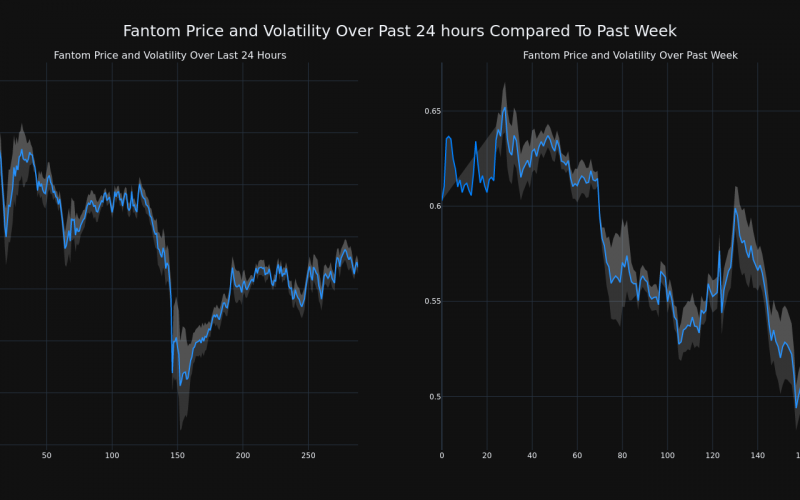 The chart below compares the price movement and volatility for Fantom over the past 24 hours (left) to its price movement over the past week (right). The gray bands are Bollinger Bands, measuring the volatility for both the daily and weekly price movements. The wider the bands are, or the larger the gray area is at any given moment, the larger the volatility.