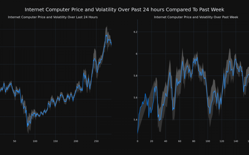 The chart below compares the price movement and volatility for Internet Computer over the past 24 hours (left) to its price movement over the past week (right). The gray bands are Bollinger Bands, measuring the volatility for both the daily and weekly price movements. The wider the bands are, or the larger the gray area is at any given moment, the larger the volatility.