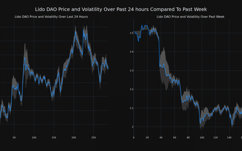 The chart below compares the price movement and volatility for Lido DAO over the past 24 hours (left) to its price movement over the past week (right). The gray bands are Bollinger Bands, measuring the volatility for both the daily and weekly price movements. The wider the bands are, or the larger the gray area is at any given moment, the larger the volatility.
