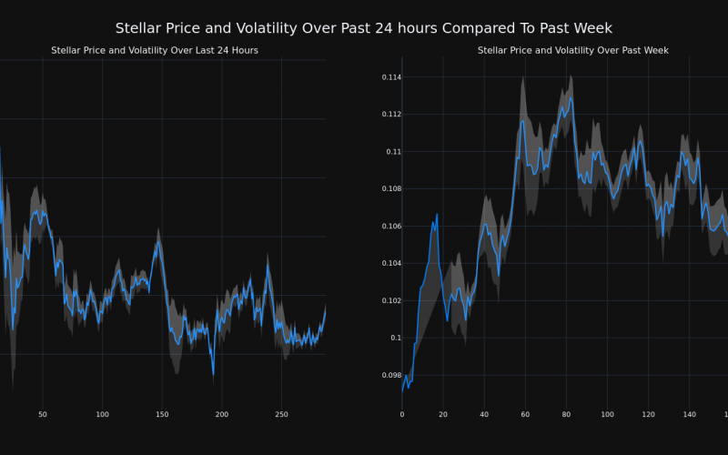 The chart below compares the price movement and volatility for Stellar over the past 24 hours (left) to its price movement over the past week (right). The gray bands are Bollinger Bands, measuring the volatility for both the daily and weekly price movements. The wider the bands are, or the larger the gray area is at any given moment, the larger the volatility.