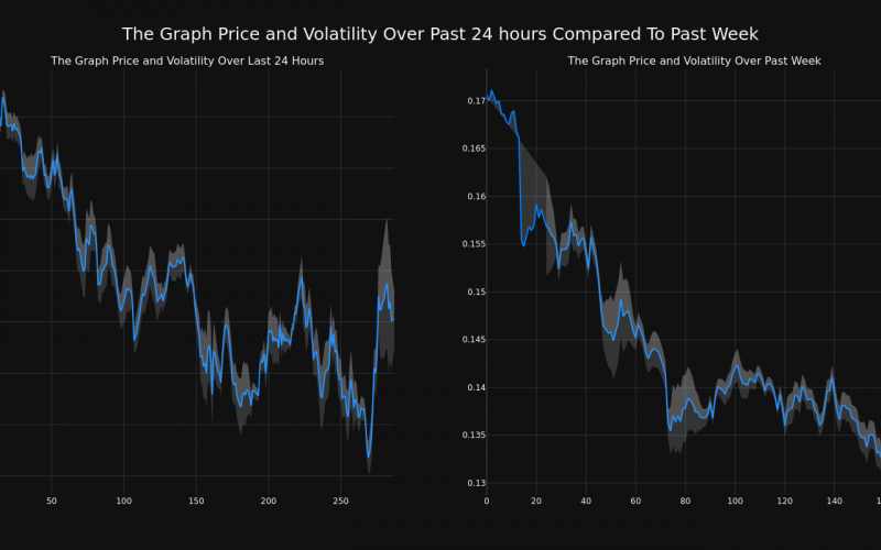 The chart below compares the price movement and volatility for The Graph over the past 24 hours (left) to its price movement over the past week (right). The gray bands are Bollinger Bands, measuring the volatility for both the daily and weekly price movements. The wider the bands are, or the larger the gray area is at any given moment, the larger the volatility.