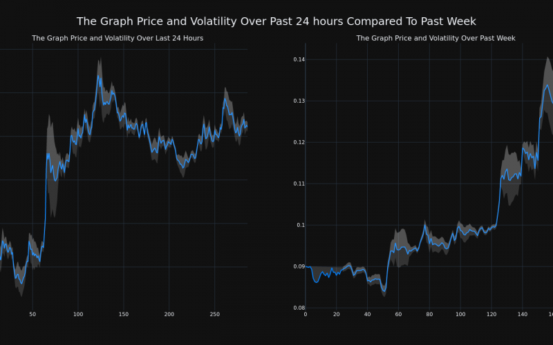 The chart below compares the price movement and volatility for The Graph over the past 24 hours (left) to its price movement over the past week (right). The gray bands are Bollinger Bands, measuring the volatility for both the daily and weekly price movements. The wider the bands are, or the larger the gray area is at any given moment, the larger the volatility.