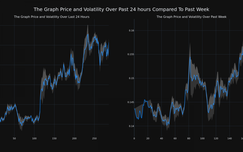 The chart below compares the price movement and volatility for The Graph over the past 24 hours (left) to its price movement over the past week (right). The gray bands are Bollinger Bands, measuring the volatility for both the daily and weekly price movements. The wider the bands are, or the larger the gray area is at any given moment, the larger the volatility.