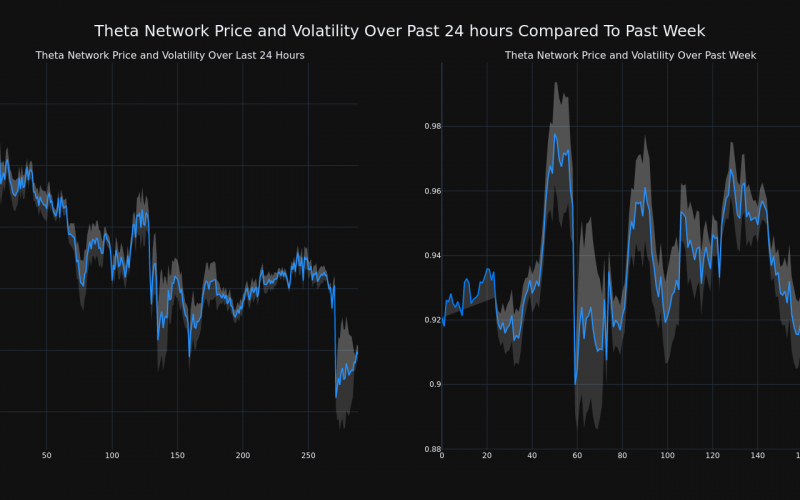 The chart below compares the price movement and volatility for Theta Network over the past 24 hours (left) to its price movement over the past week (right). The gray bands are Bollinger Bands, measuring the volatility for both the daily and weekly price movements. The wider the bands are, or the larger the gray area is at any given moment, the larger the volatility.