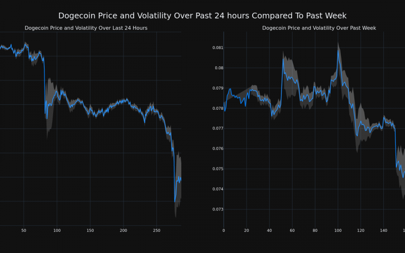 The chart below compares the price movement and volatility for Dogecoin over the past 24 hours (left) to its price movement over the past week (right). The gray bands are Bollinger Bands, measuring the volatility for both the daily and weekly price movements. The wider the bands are, or the larger the gray area is at any given moment, the larger the volatility.