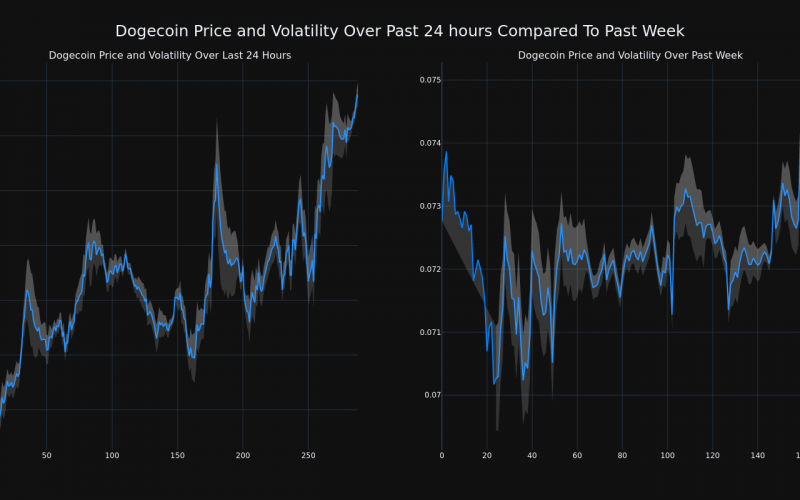 The chart below compares the price movement and volatility for Dogecoin over the past 24 hours (left) to its price movement over the past week (right). The gray bands are Bollinger Bands, measuring the volatility for both the daily and weekly price movements. The wider the bands are, or the larger the gray area is at any given moment, the larger the volatility.