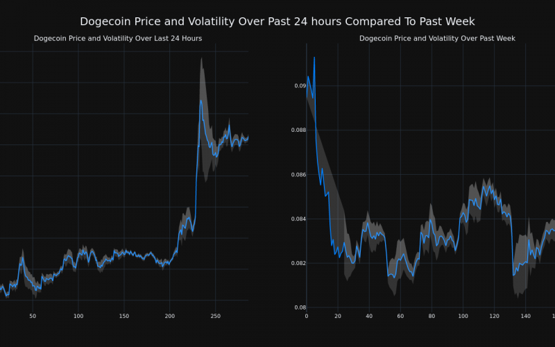 The chart below compares the price movement and volatility for Dogecoin over the past 24 hours (left) to its price movement over the past week (right). The gray bands are Bollinger Bands, measuring the volatility for both the daily and weekly price movements. The wider the bands are, or the larger the gray area is at any given moment, the larger the volatility.