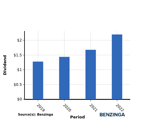 The company demonstrated a positive dividend growth pattern from 2019 to 2022, with the dividend per share rising from $1.28 to $2.20. This signifies the company’s commitment to consistently increasing shareholder dividends.