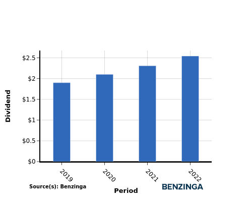 From 2019 to 2022, the company’s dividend per share showed a positive trend, increasing steadily from $1.90 in 2019 to $2.54 in 2022. This demonstrates the company’s commitment to rewarding shareholders by consistently raising dividends.
