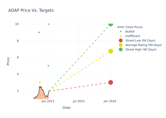 In the last 3 months, 4 analysts have offered 12-month price targets for Adaptimmune Therapeutics. The company has an average price target of $6.75 with a high of $10.00 and a low of $3.00.