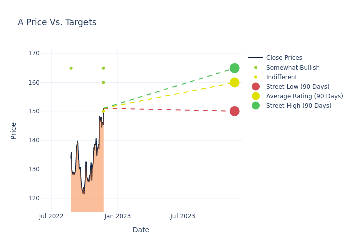 According to 4 analyst offering 12-month price targets in the last 3 months, Agilent Technologies has an average price target of $160.0 with a high of $165.00 and a low of $150.00.