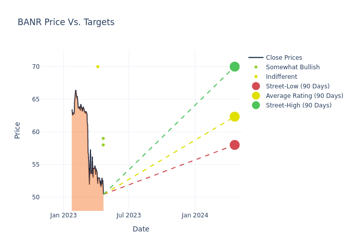 According to 5 analyst offering 12-month price targets in the last 3 months, Banner has an average price target of $63.0 with a high of $70.00 and a low of $58.00.