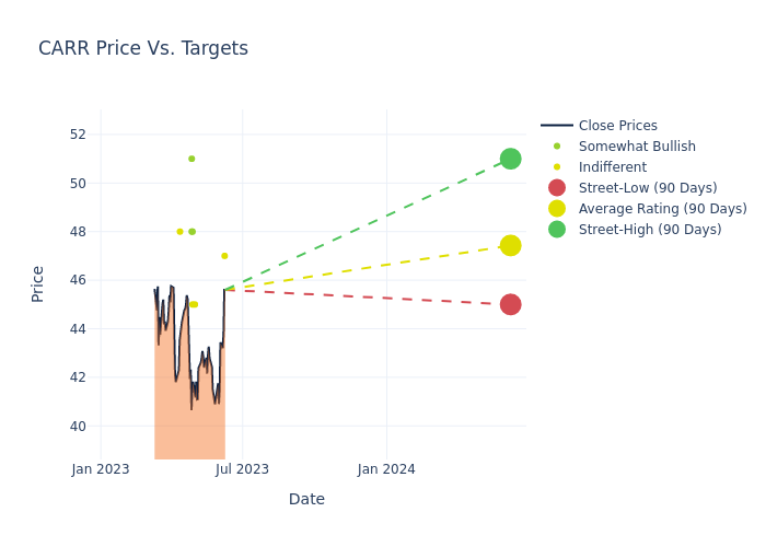 According to 12 analyst offering 12-month price targets in the last 3 months, Carrier Global has an average price target of $48.17 with a high of $51.00 and a low of $45.00.