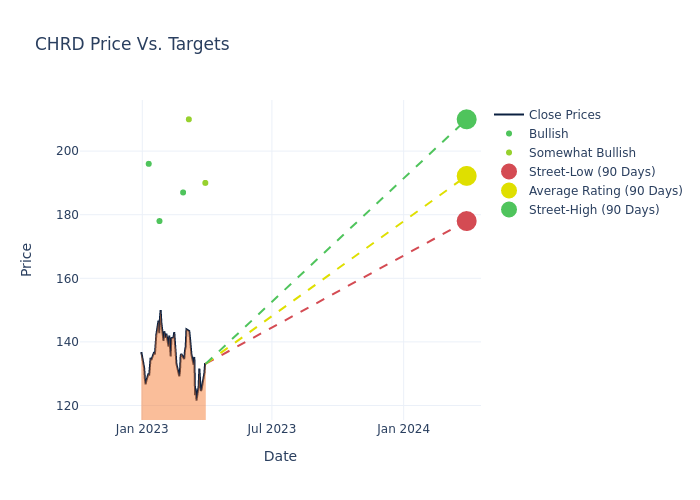According to 6 analyst offering 12-month price targets in the last 3 months, Chord Energy has an average price target of $196.33 with a high of $217.00 and a low of $178.00.