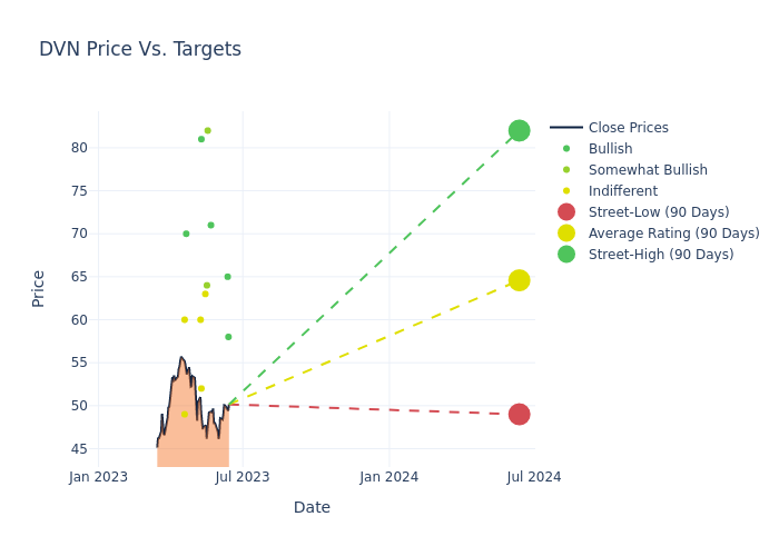According to 20 analyst offering 12-month price targets in the last 3 months, Devon Energy has an average price target of $66.25 with a high of $87.00 and a low of $49.00.