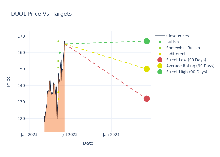 According to 10 analyst offering 12-month price targets in the last 3 months, Duolingo has an average price target of $147.9 with a high of $167.00 and a low of $131.00.