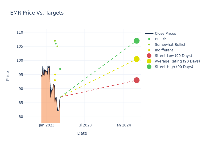 In the last 3 months, 9 analysts have offered 12-month price targets for Emerson Electric. The company has an average price target of $100.56 with a high of $109.00 and a low of $93.00.