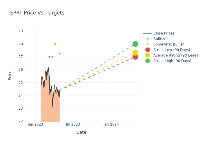 According to 4 analyst offering 12-month price targets in the last 3 months, Essential Props Realty has an average price target of $27.31 with a high of $28.00 and a low of $27.00.