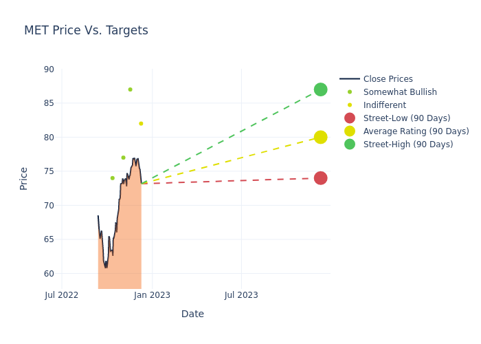 According to 5 analyst offering 12-month price targets in the last 3 months, MetLife has an average price target of $81.0 with a high of $87.00 and a low of $74.00.