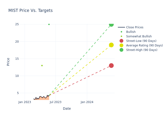 According to 5 analyst offering 12-month price targets in the last 3 months, Milestone Pharmaceuticals has an average price target of $22.6 with a high of $25.00 and a low of $13.00.