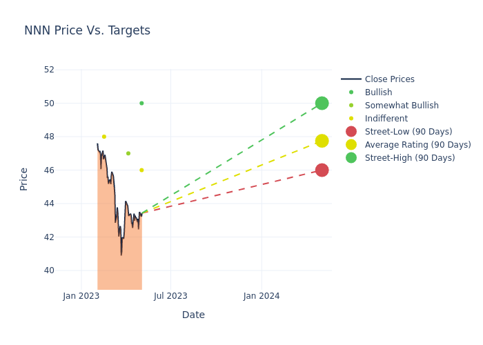 In the last 3 months, 4 analysts have offered 12-month price targets for NNN REIT. The company has an average price target of $47.75 with a high of $50.00 and a low of $46.00.